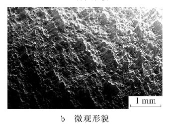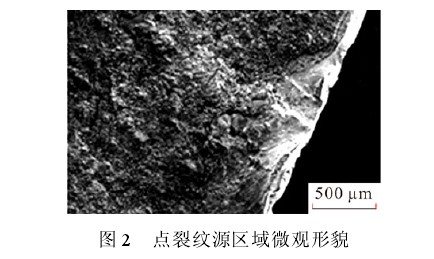 2.1.1 軸斷裂面宏觀及微觀形貌觀察 軸斷裂面處于軸上軸承安裝處的過渡圓弧區(qū)域(軸承安裝根部)。圖 1 為斷軸宏觀斷裂面,局部發(fā)生磨損,斷口表面齊整與軸向垂直,無縮頸和塑性變形痕徑。斷口疲勞條帶明顯,從外圓向中心擴展,最終瞬斷區(qū)面積小于軸截面積的 10%,說明斷軸所受名義應(yīng)力較小。