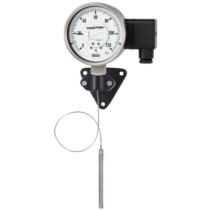 該型號(hào)溫度計(jì)內(nèi)置有波登管系統(tǒng),指針的旋轉(zhuǎn)角度和壓力大小成正比。此外,溫度計(jì)中還配有一個(gè)電子角度編碼器(非接觸式,不會(huì)產(chǎn)生磨損和摩擦),能夠檢測(cè)儀表指針的位置。編碼器在檢測(cè)到指針位置后,會(huì)產(chǎn)生與溫度大小成正比的電子輸出信號(hào)。intelliTHERM?系列溫度計(jì)基于70型膨脹式溫度計(jì)而開發(fā)(參見數(shù)據(jù)手冊(cè)TM 81.01)。