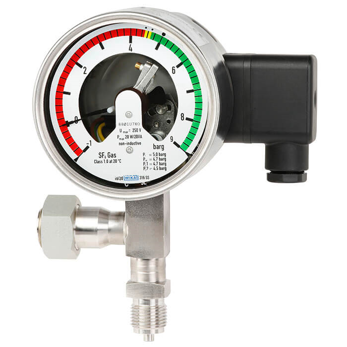 威卡氣體密度測(cè)量?jī)x能可靠地發(fā)出警示,即使在嚴(yán)苛的環(huán)境下,也能防止出現(xiàn)氣體低密度的危險(xiǎn)。當(dāng)氣體密度因泄漏而降至設(shè)定值以下時(shí),電子開關(guān)觸點(diǎn)會(huì)向設(shè)備操作員發(fā)出警示。